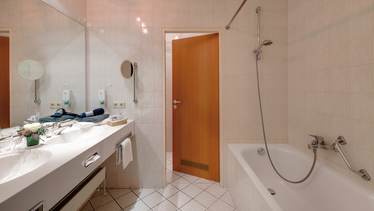 - Badezimmer mit Doppelwaschtisch, Dusche oder Badewanne, Fön