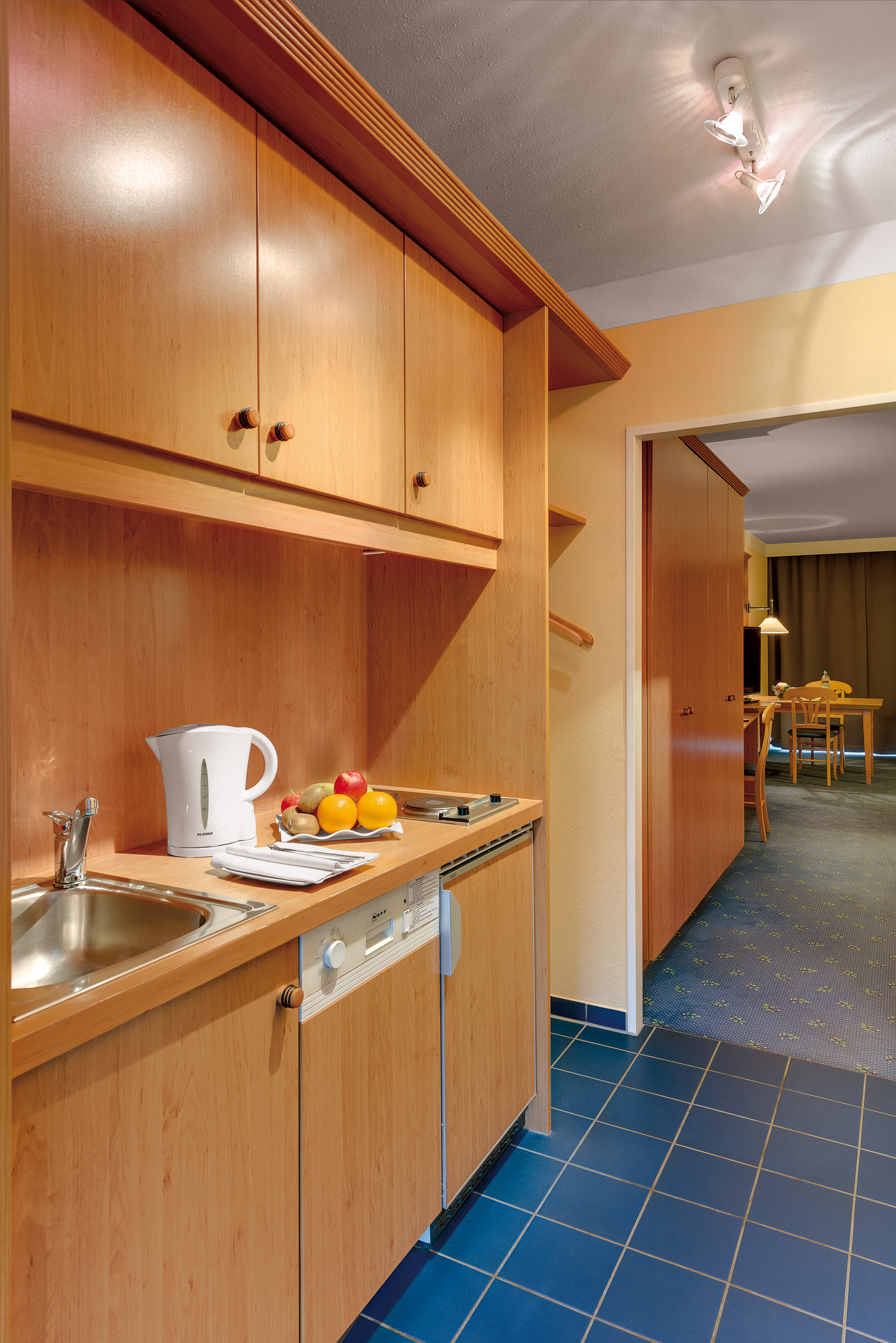 - Küchenzeile mit Kaffeemaschine, Wasserkocher, Kühlschrank – teilweise mit Geschirrspüler